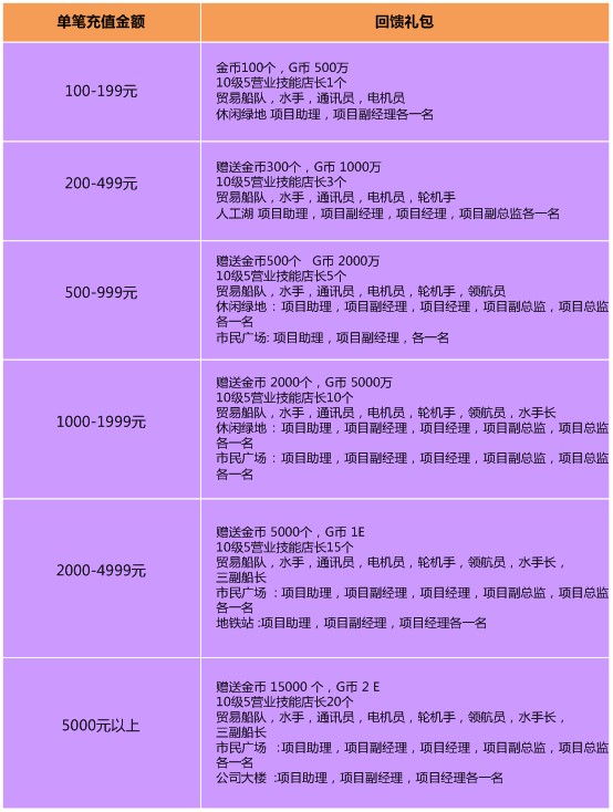 活动内容:活动期间单笔充值达到一定金额,将会获得金币、人才等回馈