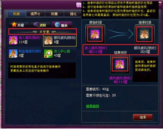 4) 继承时装会继承原始时装的阶位,星级取两者的最高星级;原始时装变为1阶0星。