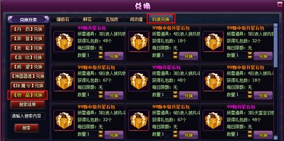 1、神秘商店出售的浪人系列时装和天堂圣羽可在兑换商城兑换大量升星石礼包。