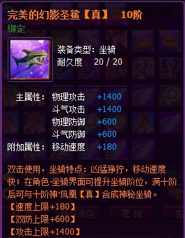 幻影圣鲨属性:速度上限+180;双防上限+600;攻击上限+1400.