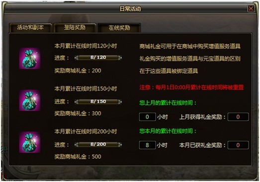 玩家可以在此查看玩家在线时间和奖励领取情况。