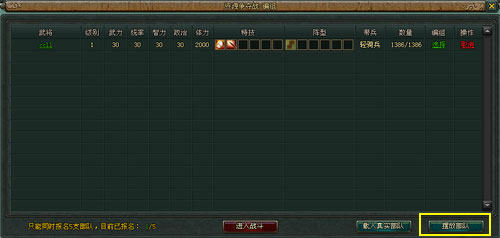 j. 兵种的初始使用为每种兵10000个,编组界面有载入真实部队的功能,其中轻步兵,轻骑兵,短弓兵额外各给2000个,编组后界面处有报名选项,报名限制报名5个;