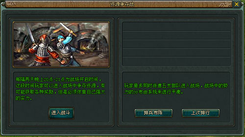 a. 资源争夺战在服务器开服第二天开放,每两天开放一次,晚20点-21点开启,玩家可点击界面右下方的“出征”按钮,进入红黄蓝三方之一,队伍为系统自动分配;