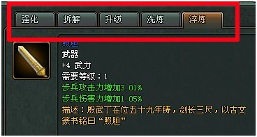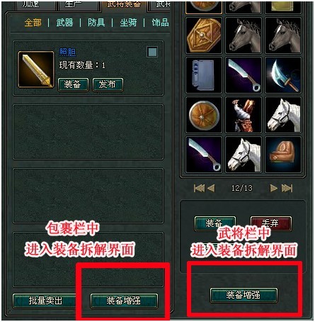 b. 玩家在包裹武将装备界面,点击“装备增强”按钮可以进入强化、拆解、淬炼、洗练界面。
