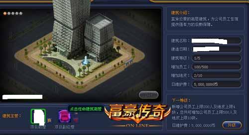 公司建筑不同于公益建筑,是独立开设的建筑,本次更新只有公司大楼一种建筑,建筑满级为5级,每升一级增加公司员工上限100人以及公司地皮上限2块,满级可以增加公司人口及公司地皮上限10块。建筑占地只需要1个街区,开设成本为1亿5千万G币,每天的维护费用需要5百万。建筑高管需要的技能为经营、管理、人际、学习、核算、策划、营销。
