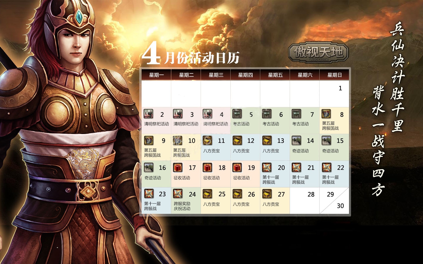 亲爱的各位玩家,傲视天地四月份活动日历已发布,以下为具体活动情况: