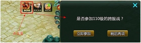 跨服BOSS战定期开放,当开启时右上方会有图标提示,点击确认参加跨服BOSS战;