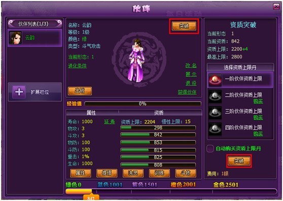 5. 新增伙伴突破功能,在伙伴界面点击打开【突破界面】,使用资质丹,可以针对不同形态的伙伴提高其资质的上限