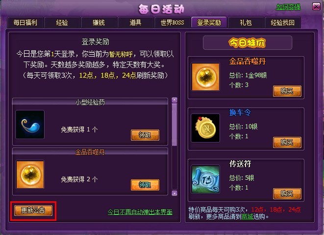1. 新增了游戏内【更新公告】界面,从每日活动界面——登陆奖励分页处打开