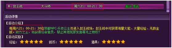 封王战有原来的周六晚上19:15-19:45,改为周六晚上21:00-21:30开启。封王战中能获得海量火能、大量经验、无数金钱。势力之王,将获得任命官员,禁止其他玩家发言等无上特权!