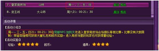 皇家竞技场由原来的每天晚上21:00-21:30,改为周一、三、五、日的晚上21:00-21:30开启。皇家竞技场内玩家通过互相竞技能获得大量礼包和钱币奖励,在竞技场内也可以获得大量经验。