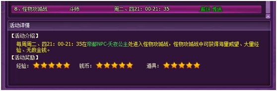 新增大型副本活动——怪物攻城战。每周二、周四21:00-21:35开启,达到斗师境界即可在帝都NPC-公主夭夜处进入。怪物攻城战中通过升级防御设施,提升自身BUFF抵御一波又一波的怪物攻击,体验爽快的战斗同时能获得大量威望、钱币、经验,也是提升势力爵位等级的重要途径哦!
