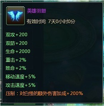 活动内容:开服前3天内,累计充值达到200元,即可免费获取英雄羽翅,英雄羽翅持续7天