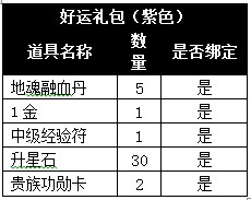 2.活动期间,每天累计送花达到399朵,(紫色)第2天即可获得“累计送花礼包(二)”包括1金【绑定】*10、高级补血丹【绑定】*5、炼魂石【绑定】*35;
