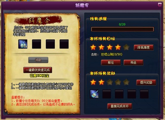 1 一键最优完成:可立即完成今天20环任务.并且每环的任务奖励为五星奖励.
