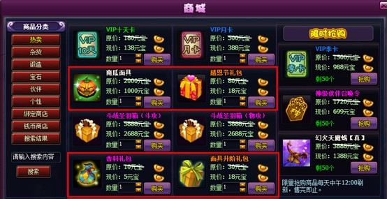 6. 商城新增南瓜面具、感恩节礼包、香料礼包、面具升阶礼包道具售卖。