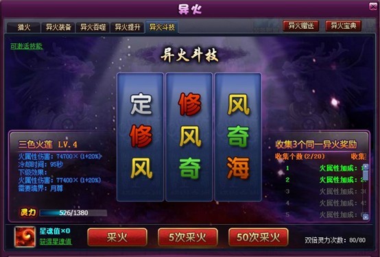 3. 新增异火斗技的高级采火,一次可使用50次。