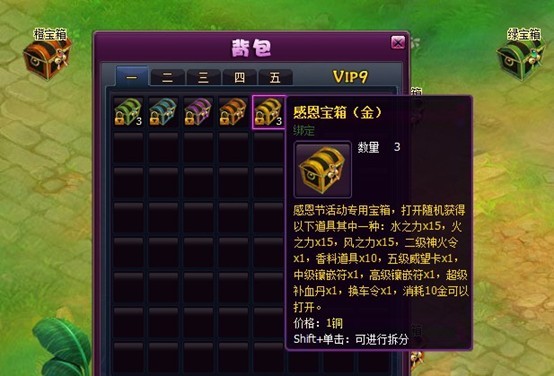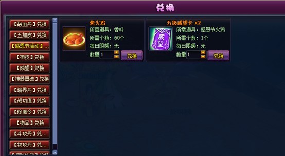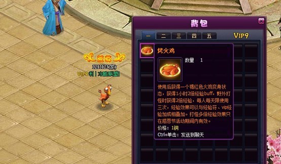 4. 宝箱所开出的所有物品都为绑定。集齐一定数量的香料道具,可以在兑换商城中兑换一个烤火鸡,点击使用获得一个褐红色的火鸡变身状态,并获得1小时的打怪2倍经验buff,野外打怪时获得2倍经验,每人每天只可以使用三次,可以与经验符,vip经验加成相叠加
