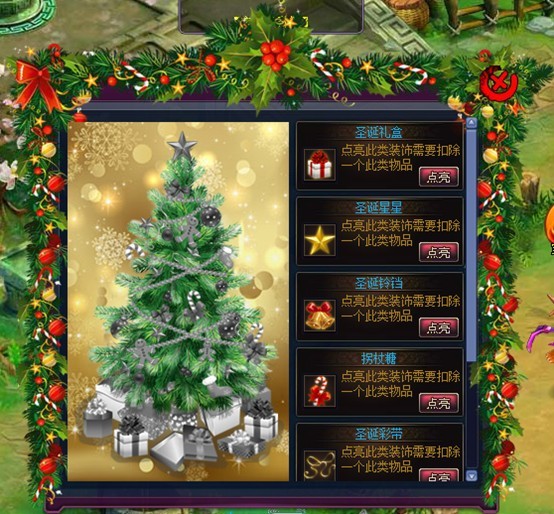2. 点击圣诞树npc会打开圣诞树界面,玩家需要收集各种圣诞树的装饰品通过界面来提交,每提交一种装饰品,界面左侧的圣诞树将点亮对应的装饰,并获得一个圣诞树礼包,有几率可以开出各种四、五阶宝石(圣诞树装饰道具可以在活动二中获得或在商城购买)