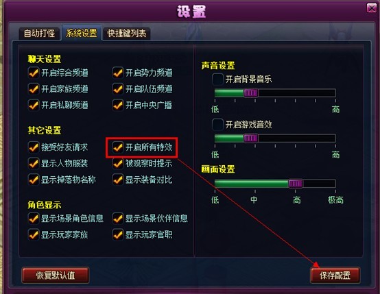 需要在系统设置中将【开启所有特效】选项打勾并【保存配置】才可正常观赏哦~