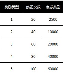 1. 祭祀到一定次数(含免费次数)即可获得点券奖励,详细见下表。