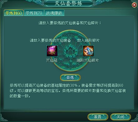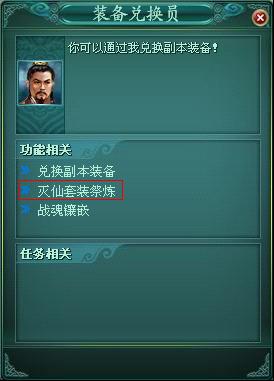 在副本中收集了足够的“灭仙碎片”可以兑换“灭仙套装”,角色修为段提升后(60级、70级)分别可以继续“灭仙碎片”将灭仙套装进行祭炼,提升装备的等级。
