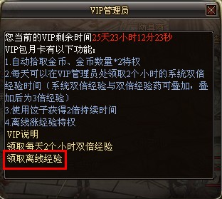VIP玩家上线以后与VIP管理员对话,单击领取离线经验选项
