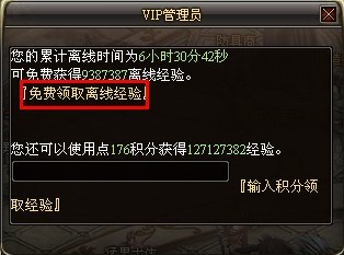 VIP离线后将自动获得增长经验,再次登录游戏后可以在VIP管理员处领取经验,如果使用一定的积分,则可以获得若干倍经验奖励
