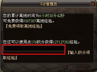 VIP用户可以选择输入任意积分数量即可兑换到等比例的多倍离线经验奖励
