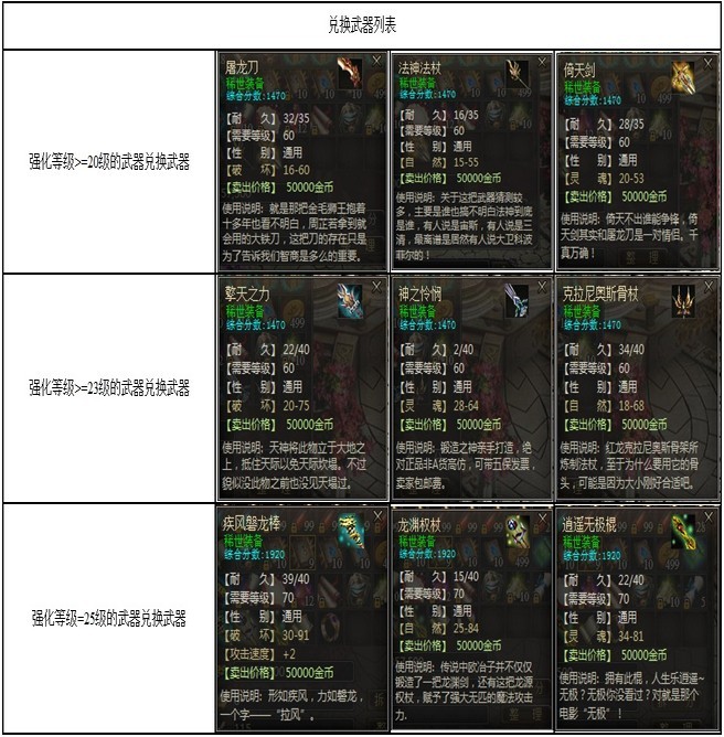 所有武器强化等级 =20的武器,可以在礼品兑换员处自选:屠龙刀,倚天剑,法神法杖中的一件.