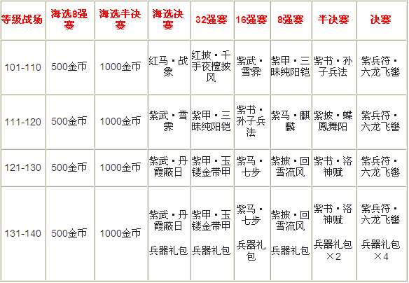跨服战奖励:共4个级别共7个赛场,奖励更为丰富,为每个级别的霸者量身定做。详见下表2。