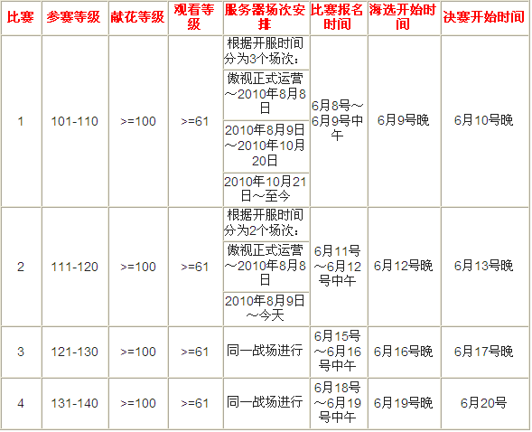 赛程安排:本届跨服战将分为4个级别、7个赛场进行,让更多的人有机会获得桂冠。具体安排详见表1。