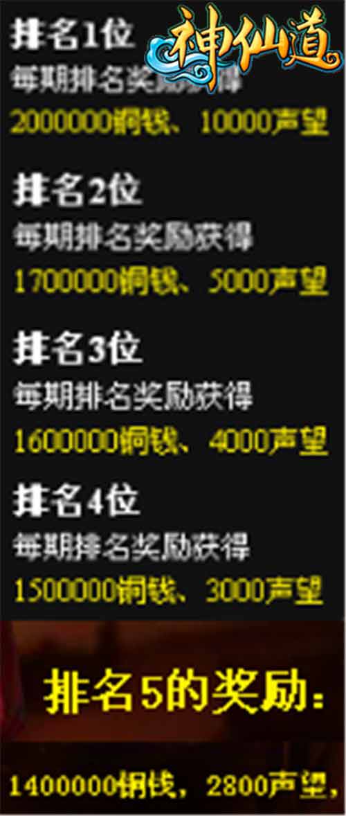 由于英雄榜的前几名不是所有玩家都能进入,于是前几名玩家的奖励就是陪游神仙道江湖上人人希望获知的消息。笔者现将竞技场排名前五的奖励公开给各位玩家: