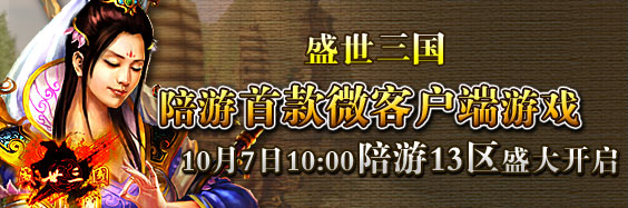 陪游《盛世三国》13区将于10月7日上午10:00震撼开启,与此同时,我们还为各位玩家准备了丰富的活动和好礼,助英雄们驰骋沙场!