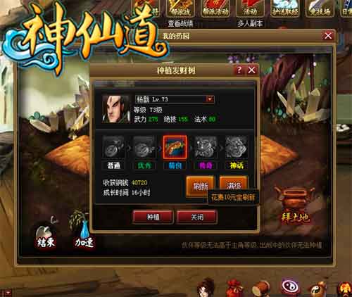 陪游神仙道种植园中需要有没出阵的伙伴才能种植,种植的伙伴级别的高低会改变种植收益的多少。例如50级的孟婆种经验树能得到的收益就比30级的孟婆多很多,发财树也是一样的道理。很多玩家或者会认为发财树种得钱财太少了,但是当玩家弹尽粮绝的时候,发财树种出来的一点点小钱或者就显得弥足珍贵了。