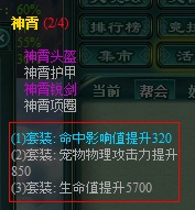装备两件神霄套装可触发隐藏属性:增加主人320点命中值