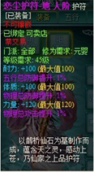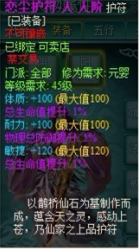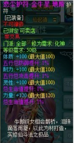 人阶恋尘护符:分为天、地、人三种,其中特色属性+120(满),其余两属性+100(满),另附3个紫色1%随机属性