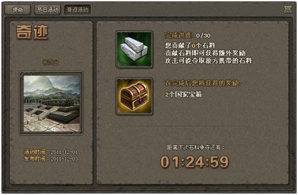 发布奇迹:每次石料争夺战期间一个国家只能发布一次奇迹目标(一天5次),奇迹一旦发布就不可以取消。如果在每次石料争夺战之前,国王没有发布的话,系统在开始时自动会发布最简单的奇迹建设。