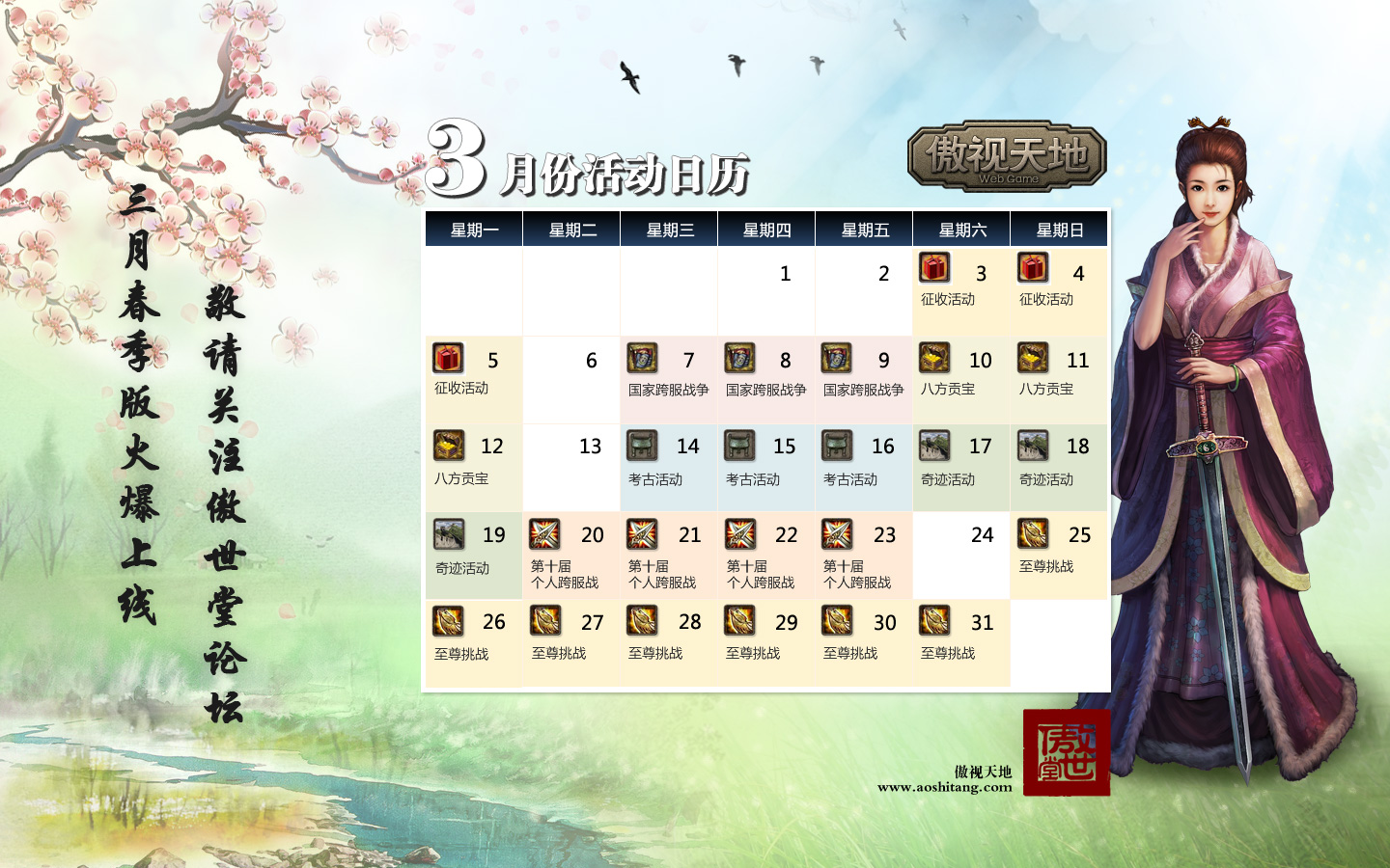 各位玩家,陪游《傲视天地》3月份活动日历,新鲜出炉!更多有趣好玩的游戏活动让您一度为快,更多精彩内容敬请留意陪游《傲视天地》~