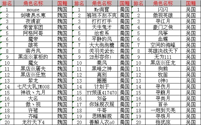 以下是截止3月10日14:00, 各国威望排名前20名的玩家名单: